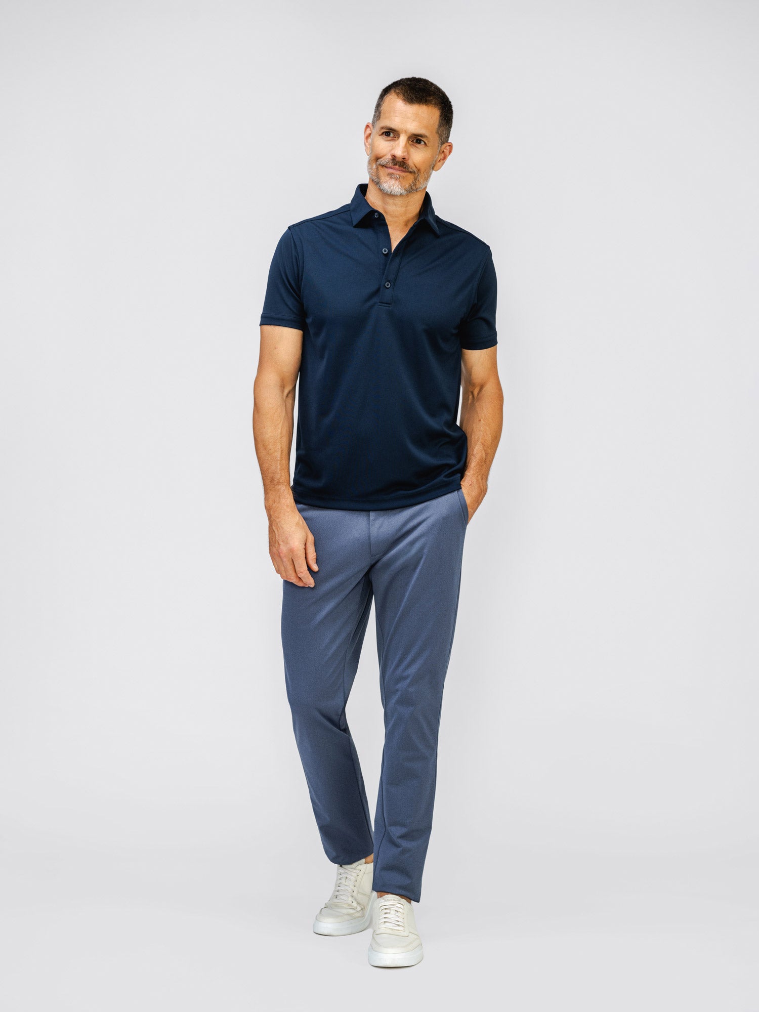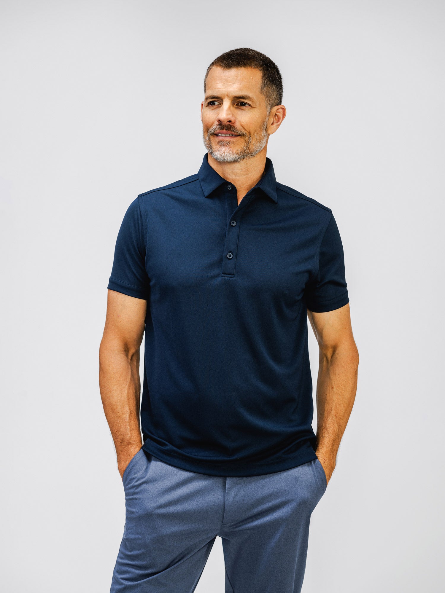 Fit to stay close to the body, with amazing stretch to move around and stay comfortable. Our polos and tees fit between our slim and standard cuts, so make sure to size up if you prefer a looser fit.