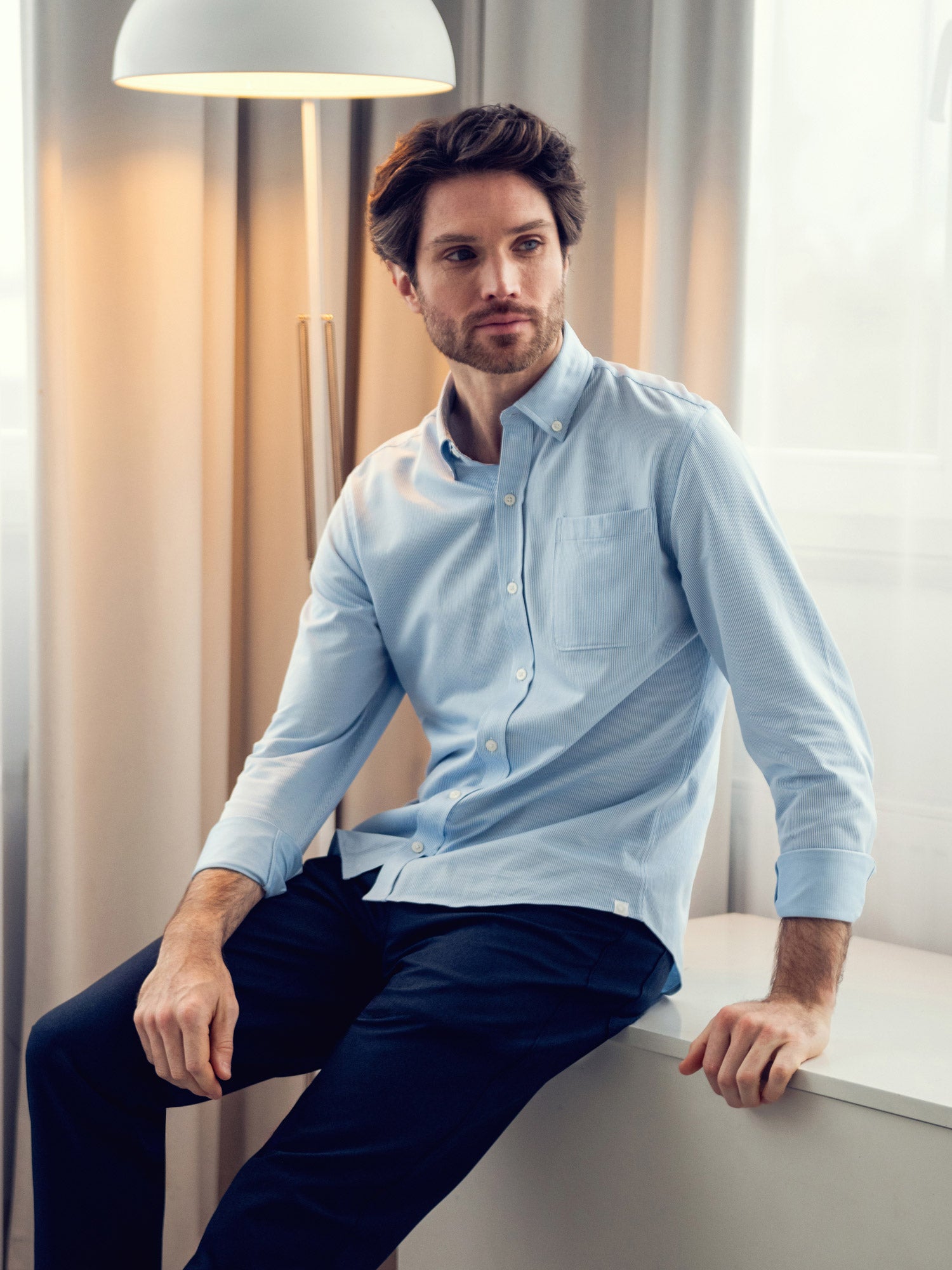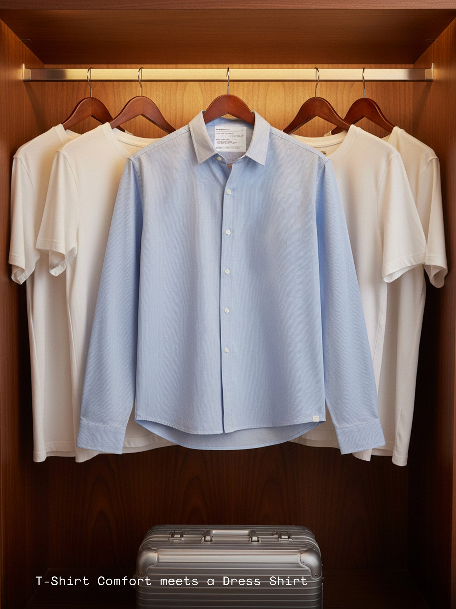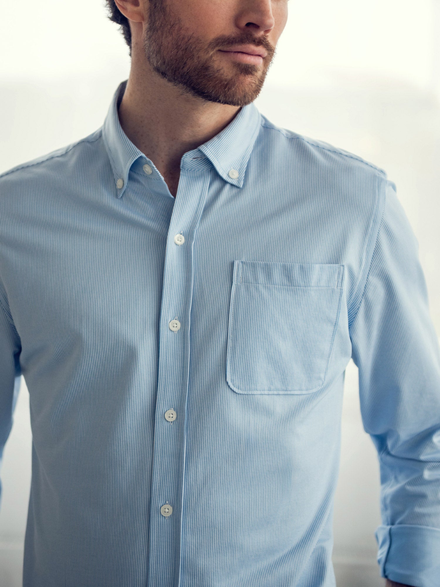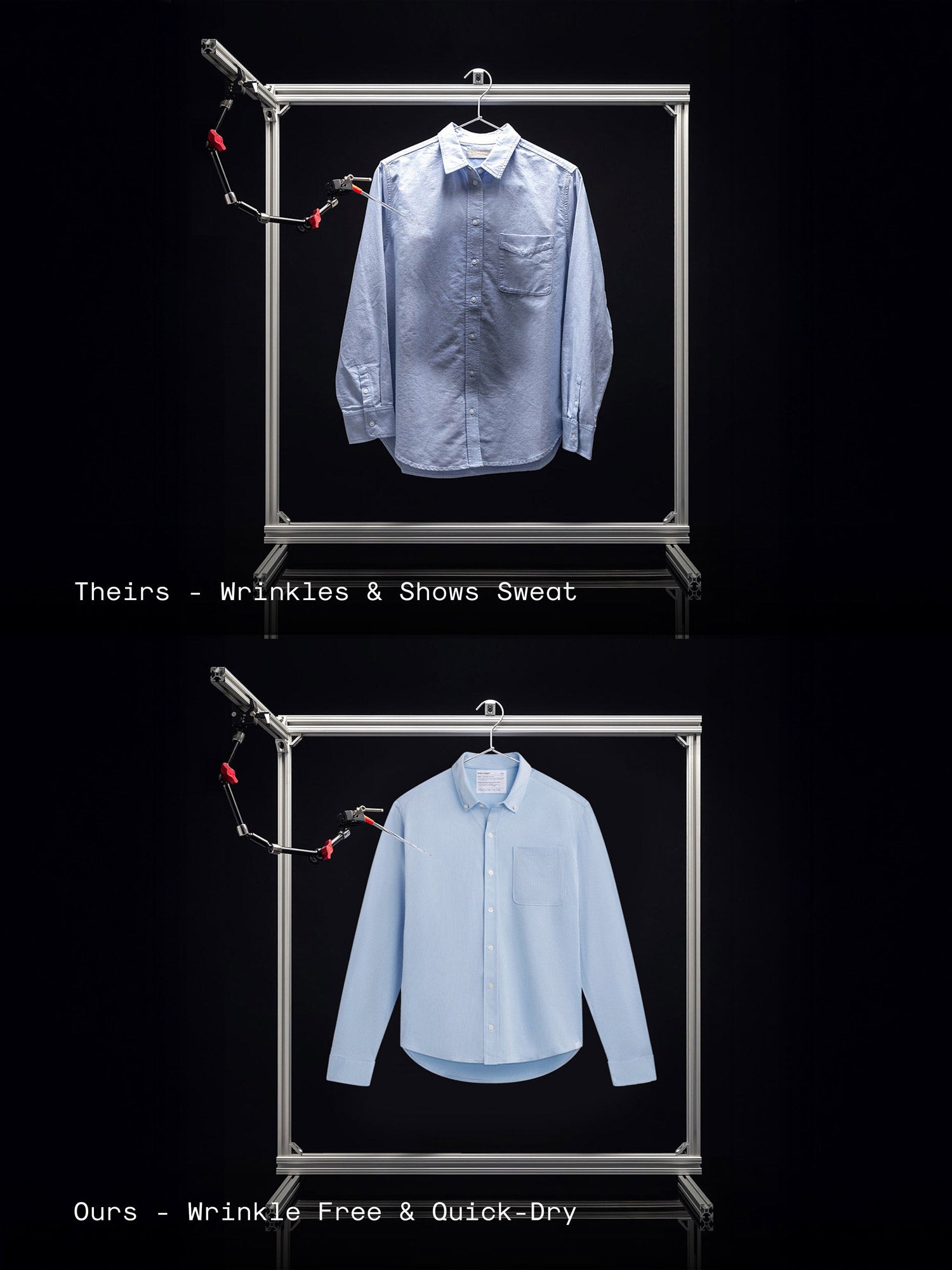 Problem: Traditional button shirts are stiff and prone to wrinkle, breaking down as they break in.