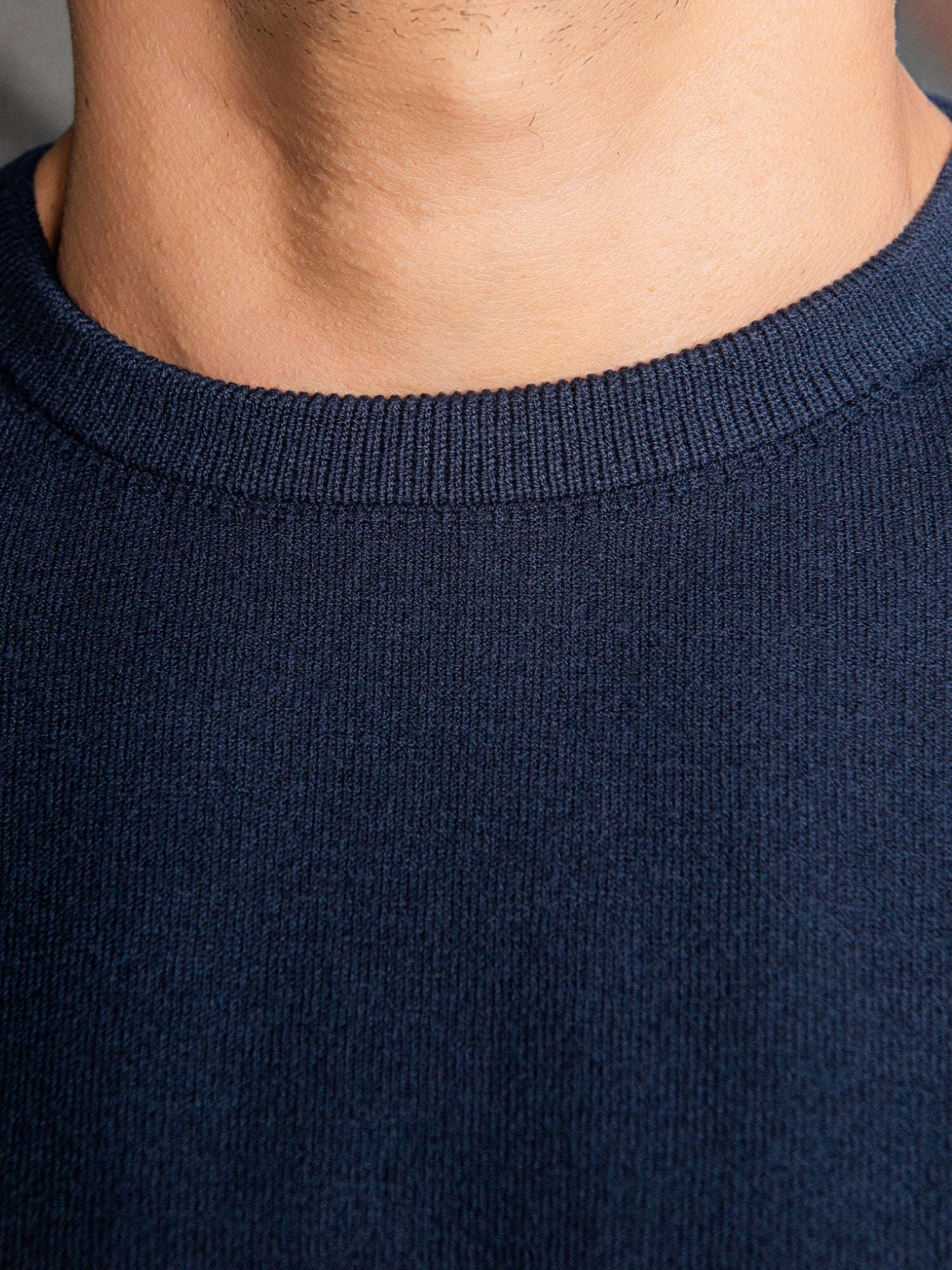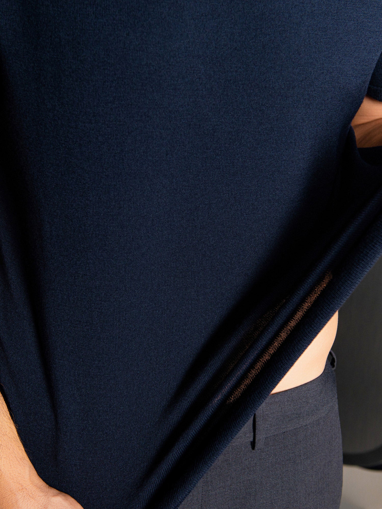 Our Solution: A sophisticated, sweater-knit “dress tee” built for cross-season comfort and unparalleled durability.