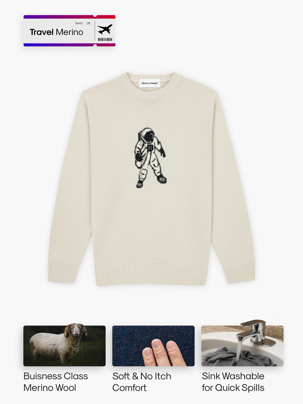 Knit from ultra-soft 19.5 micron Merino wool, it’s breathable, temperature-regulating, and comfortable enough for daily orbit, yet polished enough to wear on Earth right after landing.