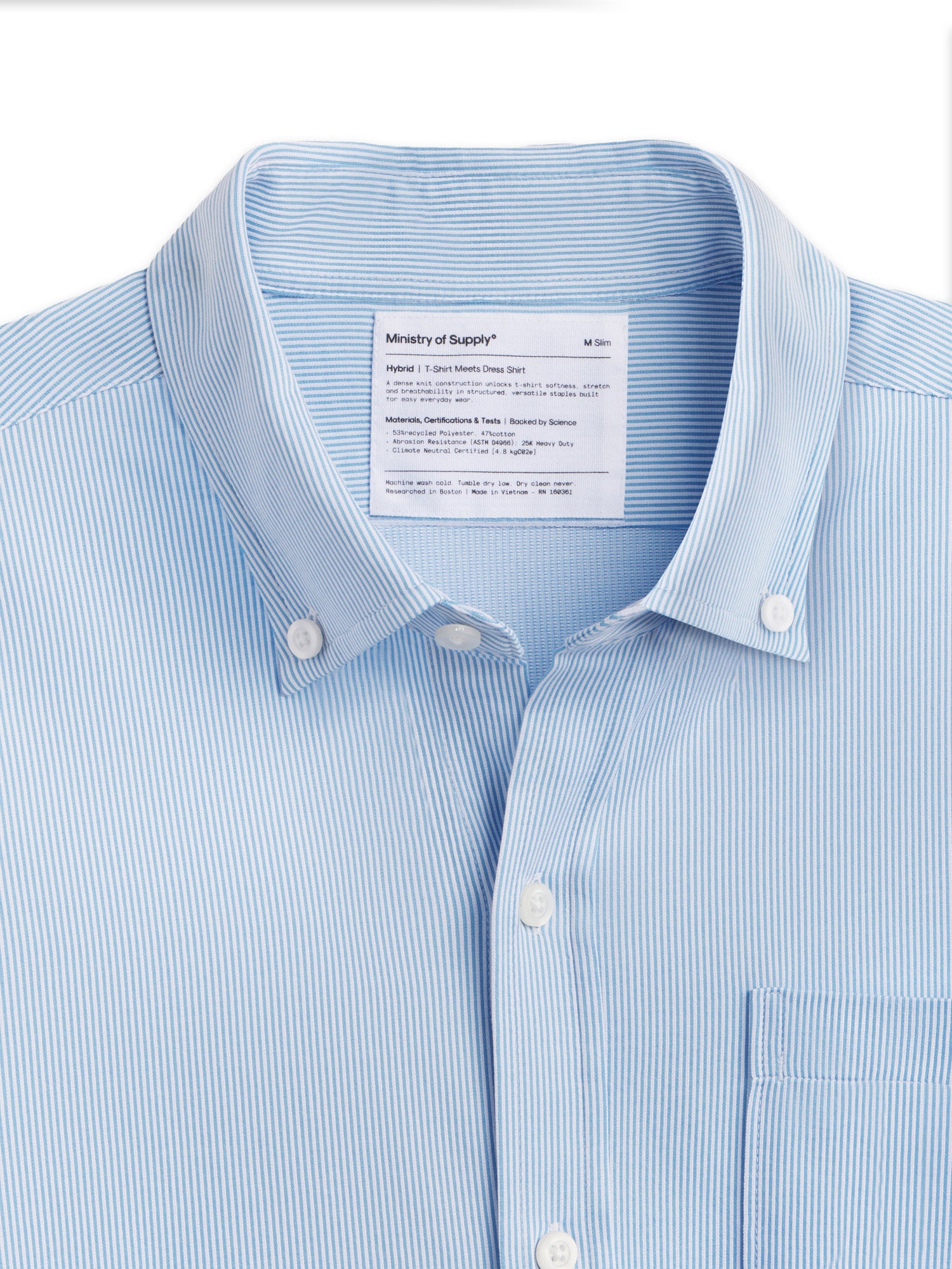 Machine Washability (AATCC 135), Wrinkle Resistance (AATCC 128), Stretch (ASTM D2594), Quick Dry (AATCC 197) with a Carbon Footprint of 4.8 kgCO2e