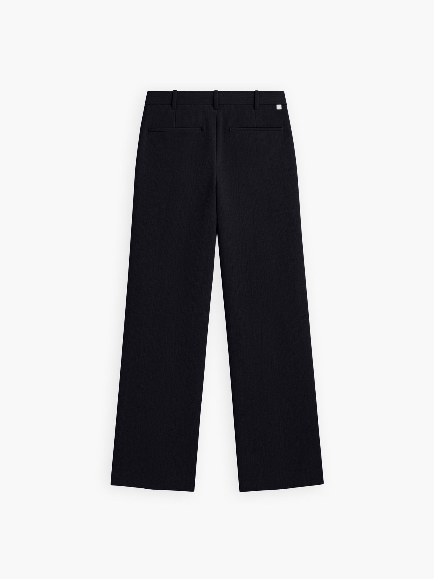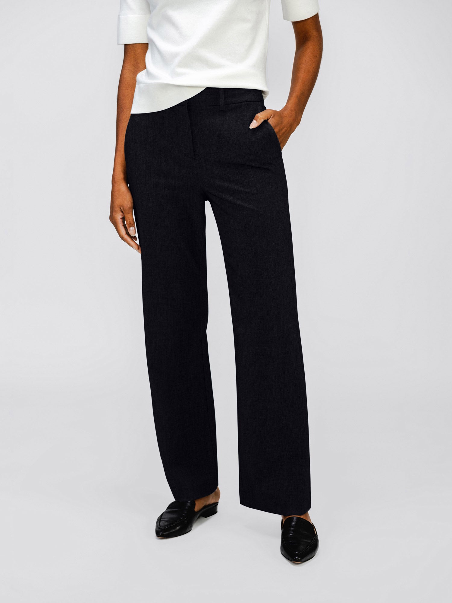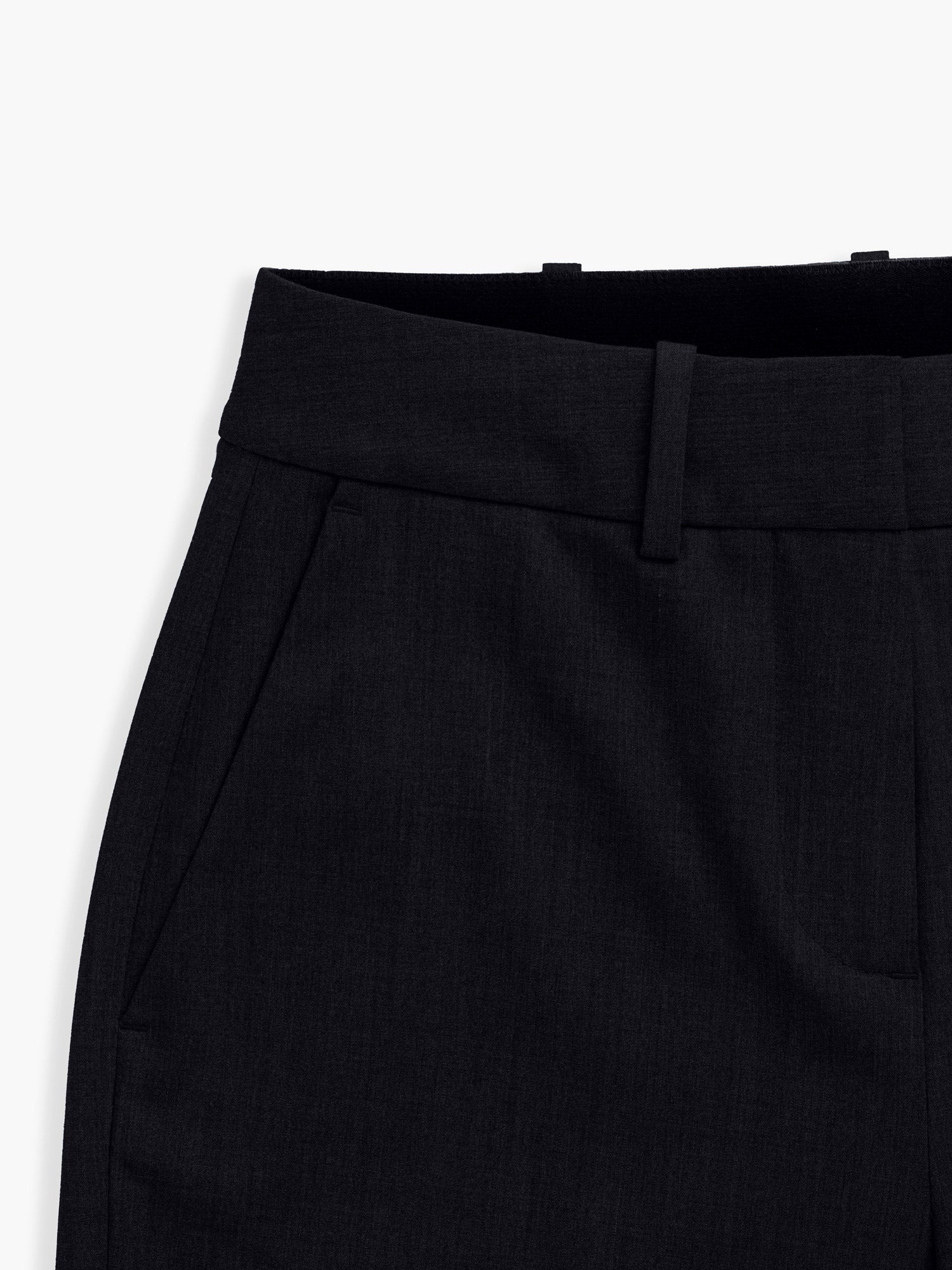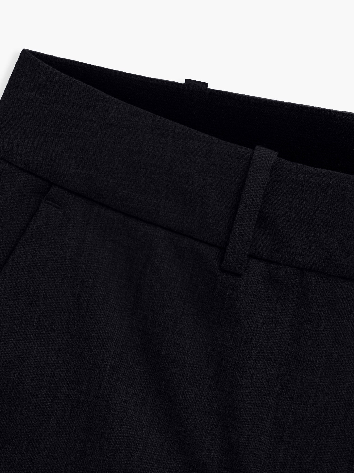 • Stretch waistband with front fly, belt loops + bar and hook closure