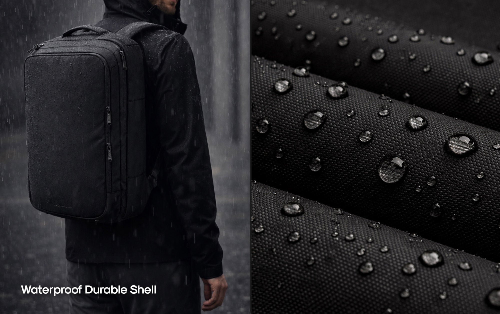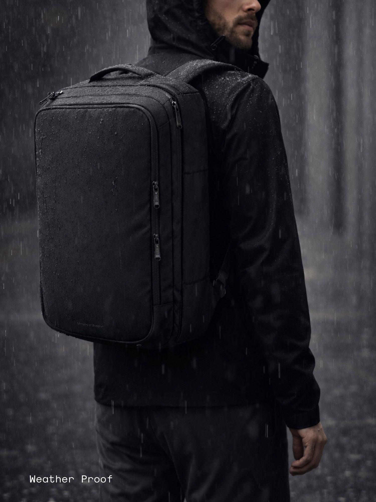 900D waterproof polyester and waterproof YKK zippers keep contents protected in rain and transit.