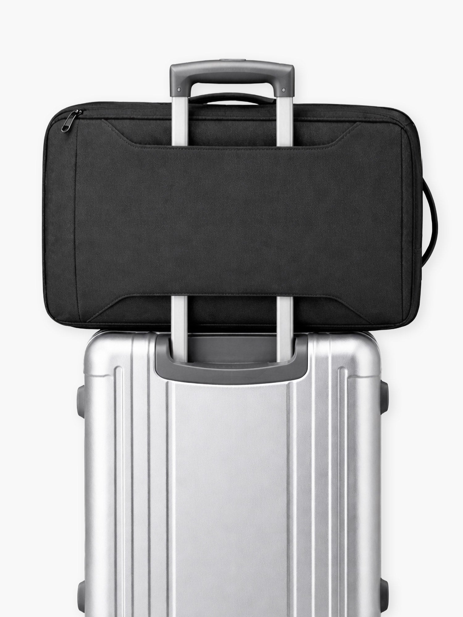 • Roll-aboard handle pass-through for stacking with luggage