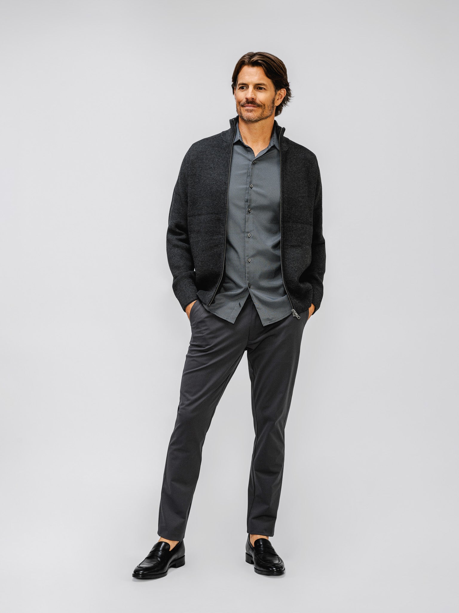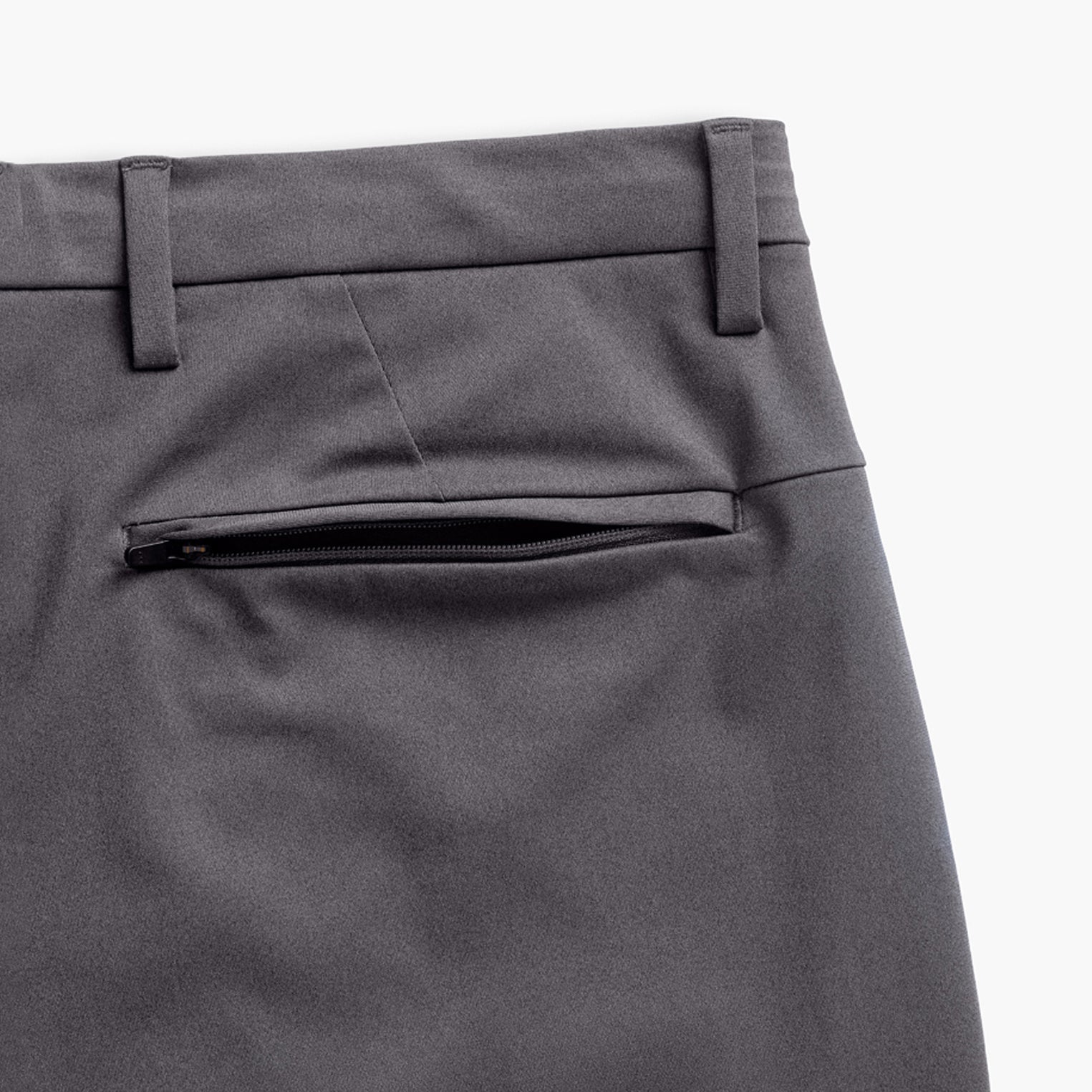 men's charcoal kinetic tapered pant flat shot of front model wearing olive solid apollo shirt and charcoal kinetic tapered pant walking forward with hands clasped men's charcoal kinetic tapered pant zoomed shot of front model wearing mens kinetic pant charcoal and mens aero zero dress shirt charcoal mini grid in studio men's charcoal kinetic tapered pant zoomed shot of rear zippered pocket