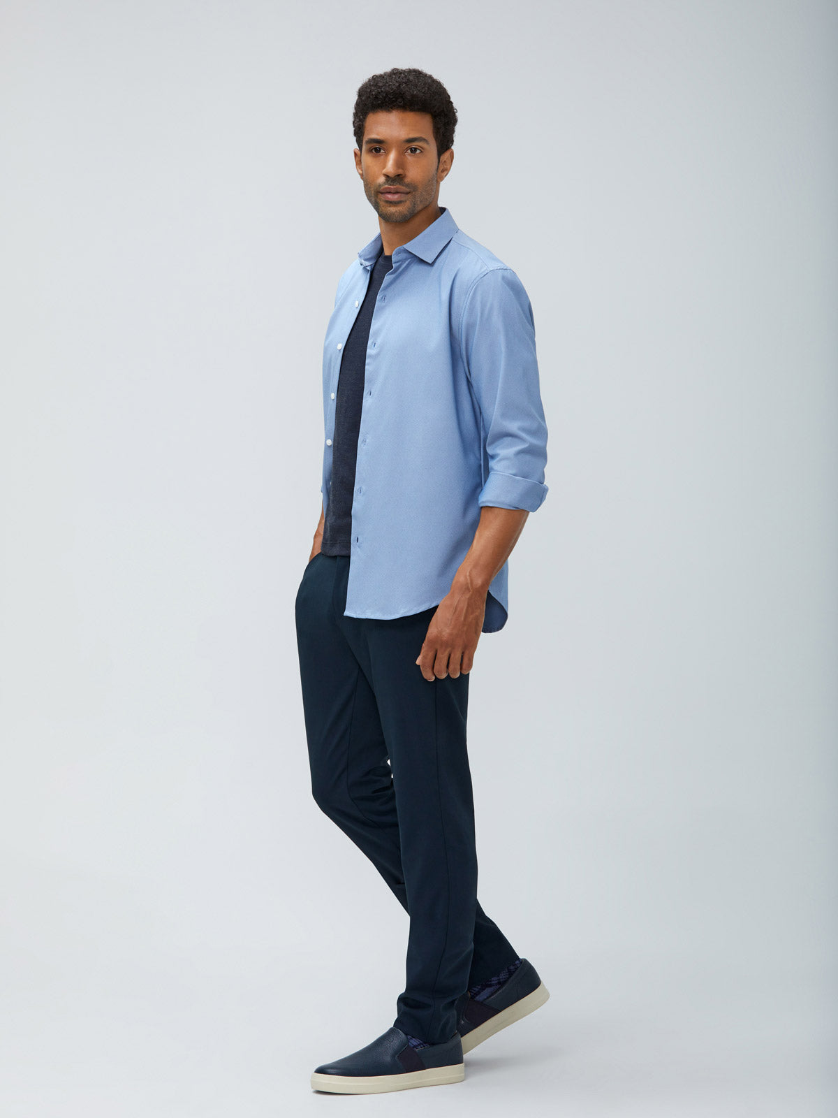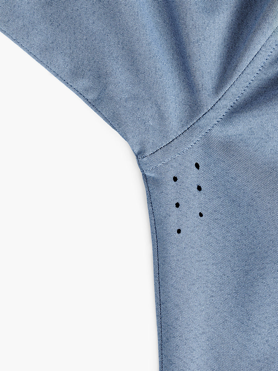 Men's Blue Oxford Aero Zero Dress Shirt front Men's Blue Oxford Aero Zero Dress Shirt and Men's Dark Navy Velocity Pant on model walking left Men's Blue Oxford Aero Zero Dress Shirt back mens aero zero dress shirt blue oxford flat