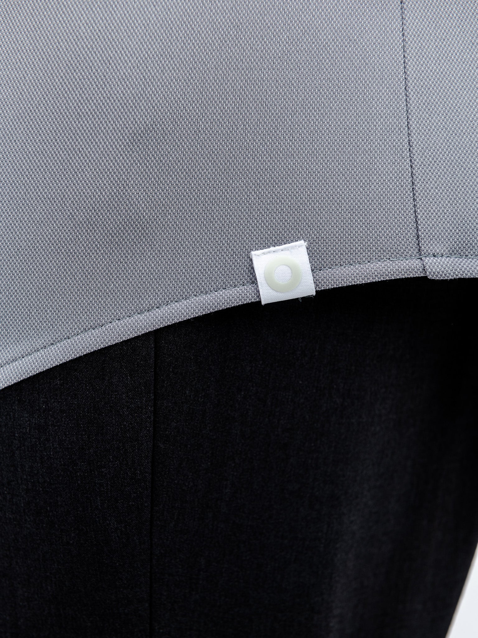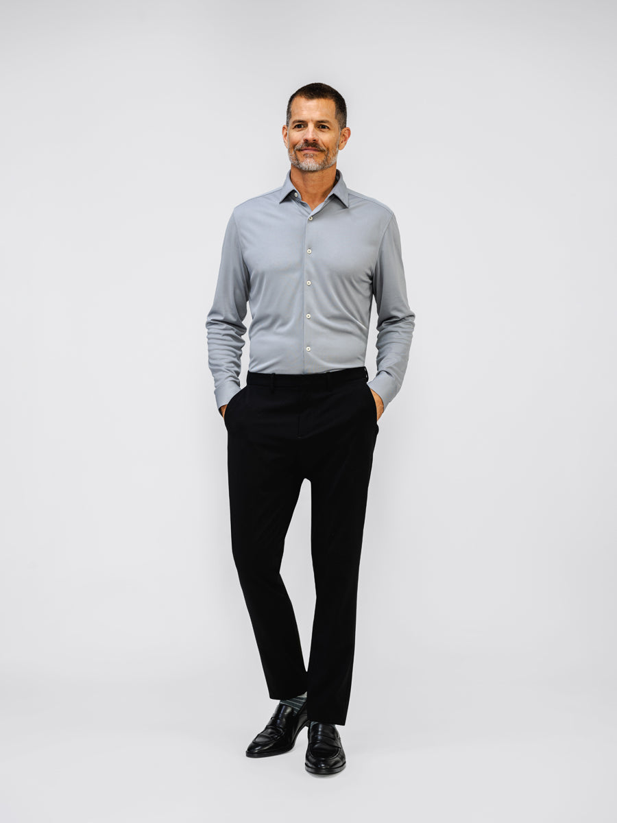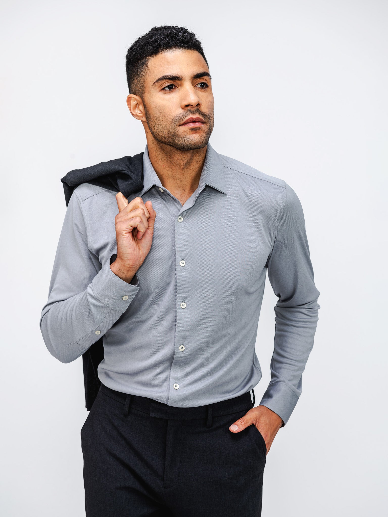 mens apollo dress shirt new grey oxford front full flat Men's New Grey Oxford Apollo Dress Shirt on model holding suit jacket over shoulder mens apollo dress shirt new grey oxford back full flat mens apollo dress shirt new grey oxford mens velocity dress pant black on model in studio Degree logo on Men's New Grey Oxford Apollo Dress Shirt on model