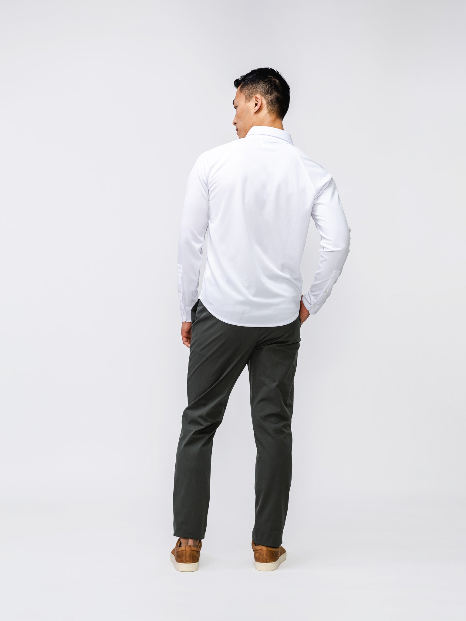 men's white apollo raglan sport shirt flat shot of front men's white apollo raglan sport shirt flat shot of back model wearing mens apollo raglan sport shirt detailed short stretching sleeve model wearing mens apollo raglan sport shirt and mens pace poplin buff chino upper torso looking sideways walking shot Back of White Men's Apollo Raglan Sport Shirt and Olive Kinetic Pant on model