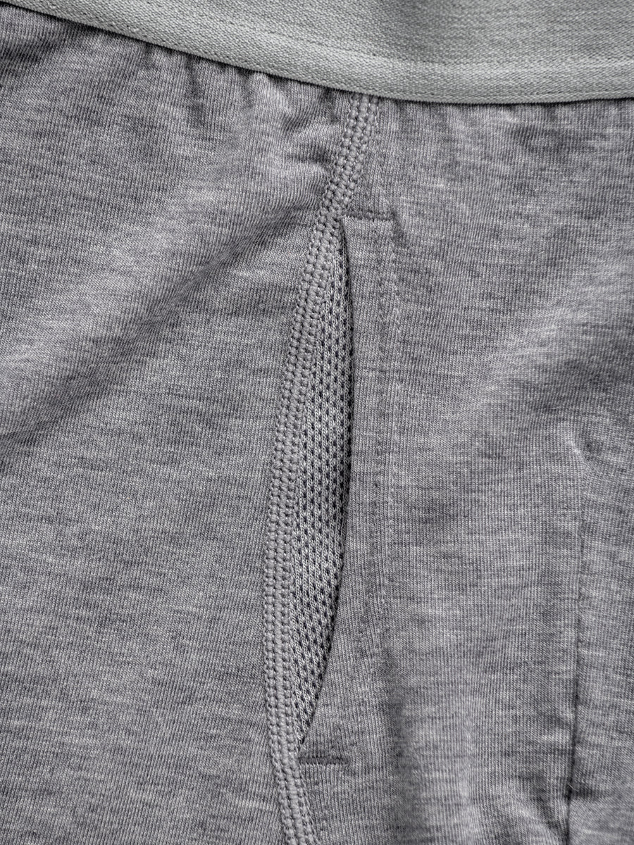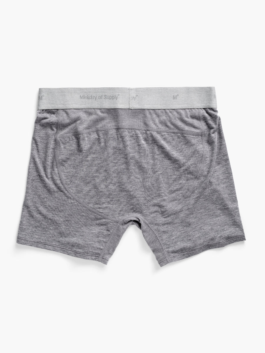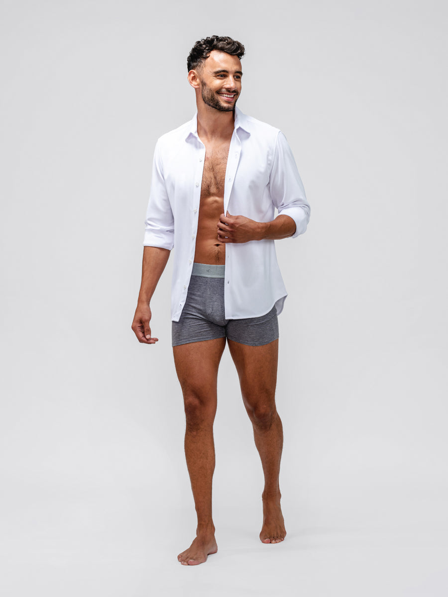 men's medium grey heather composite merino boxer brief flat shot of front model wearing men's medium grey heather composite merino boxer brief and white v neck atlas tee facing forward men's medium grey heather composite merino boxer brief flat shot of back men's medium grey heather composite merino boxer brief close up of fly opening with mesh ventilation model wearing men's medium grey heather composite merino boxer brief and white aero zero dress shirt facing forward with shirt unbuttoned