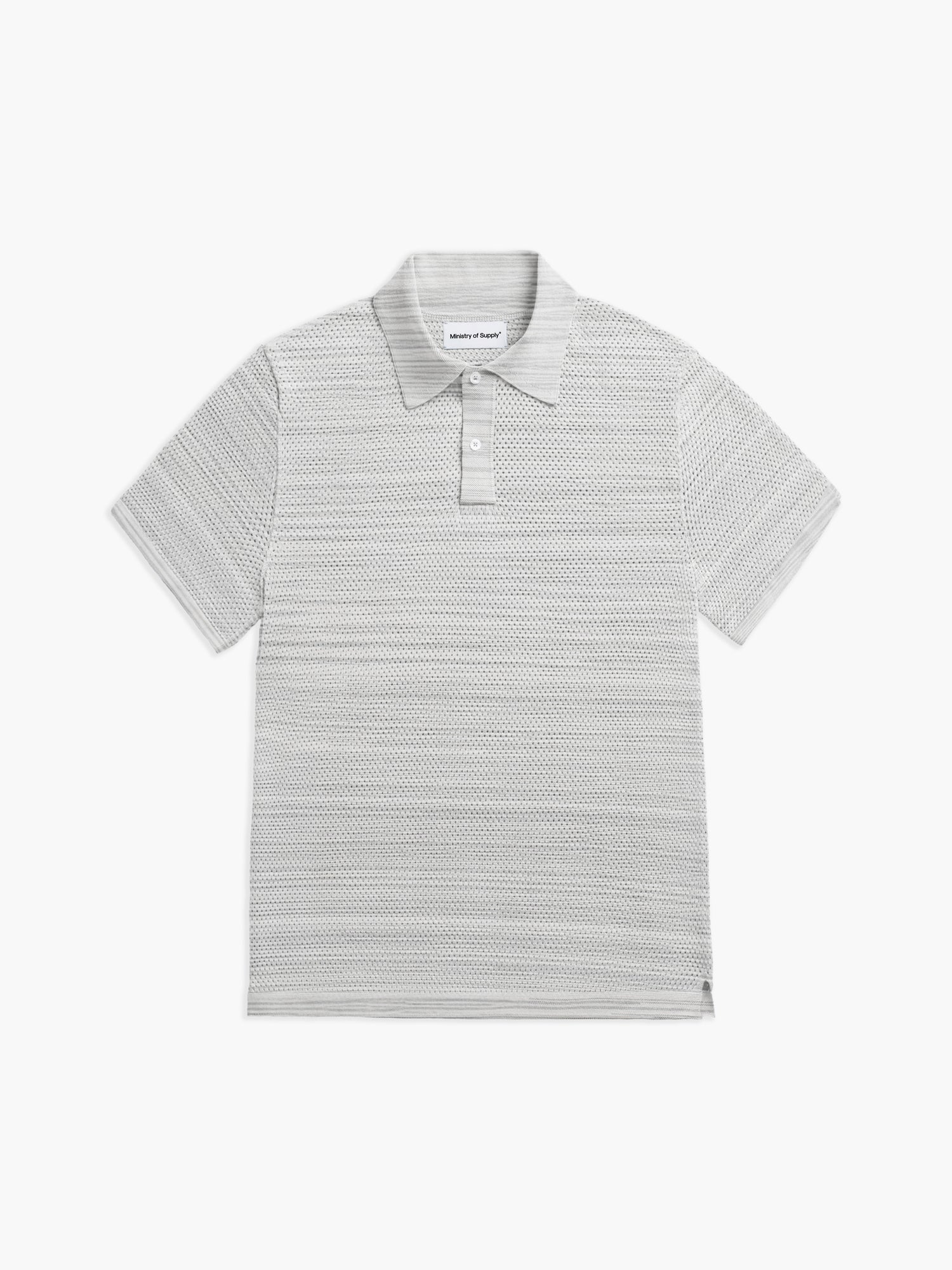 A marling process of two tonal yarns during the knitting process creates a random and truly unique pattern for each polo.