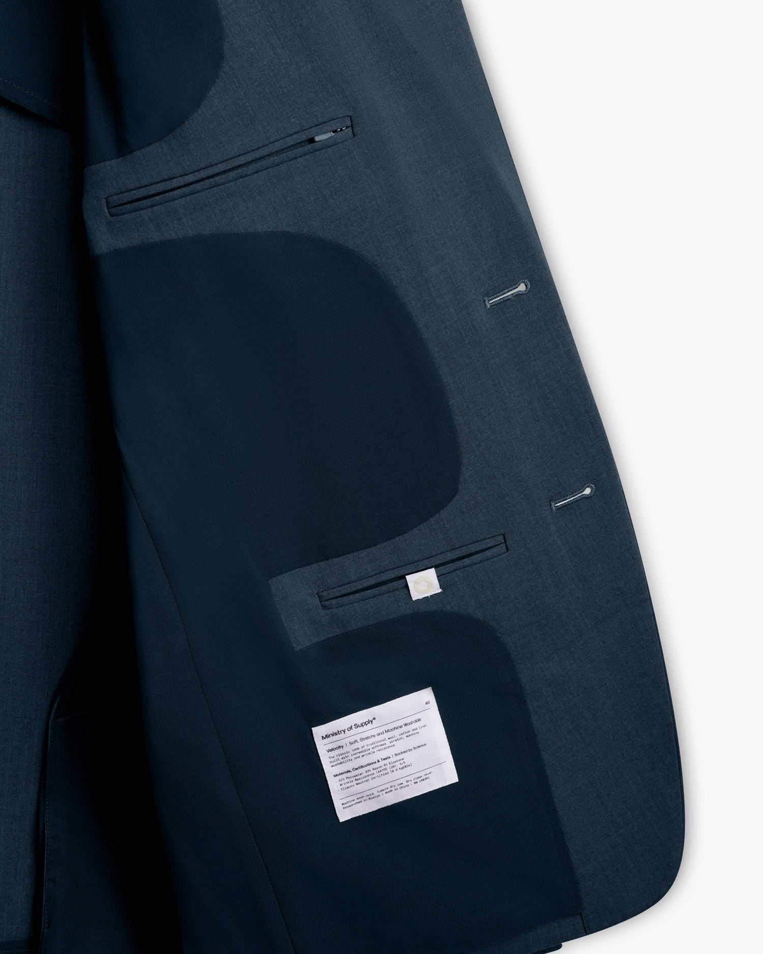 Performance Tests Passed: Machine Washability (AATCC 135), Wrinkle Resistance (AATCC 128), Stretch (ASTM D2594). Made out of 33% Bio-Based Content, Velocity Suit Jacket has a Carbon Footprint of only 10.5 kgCO2e
