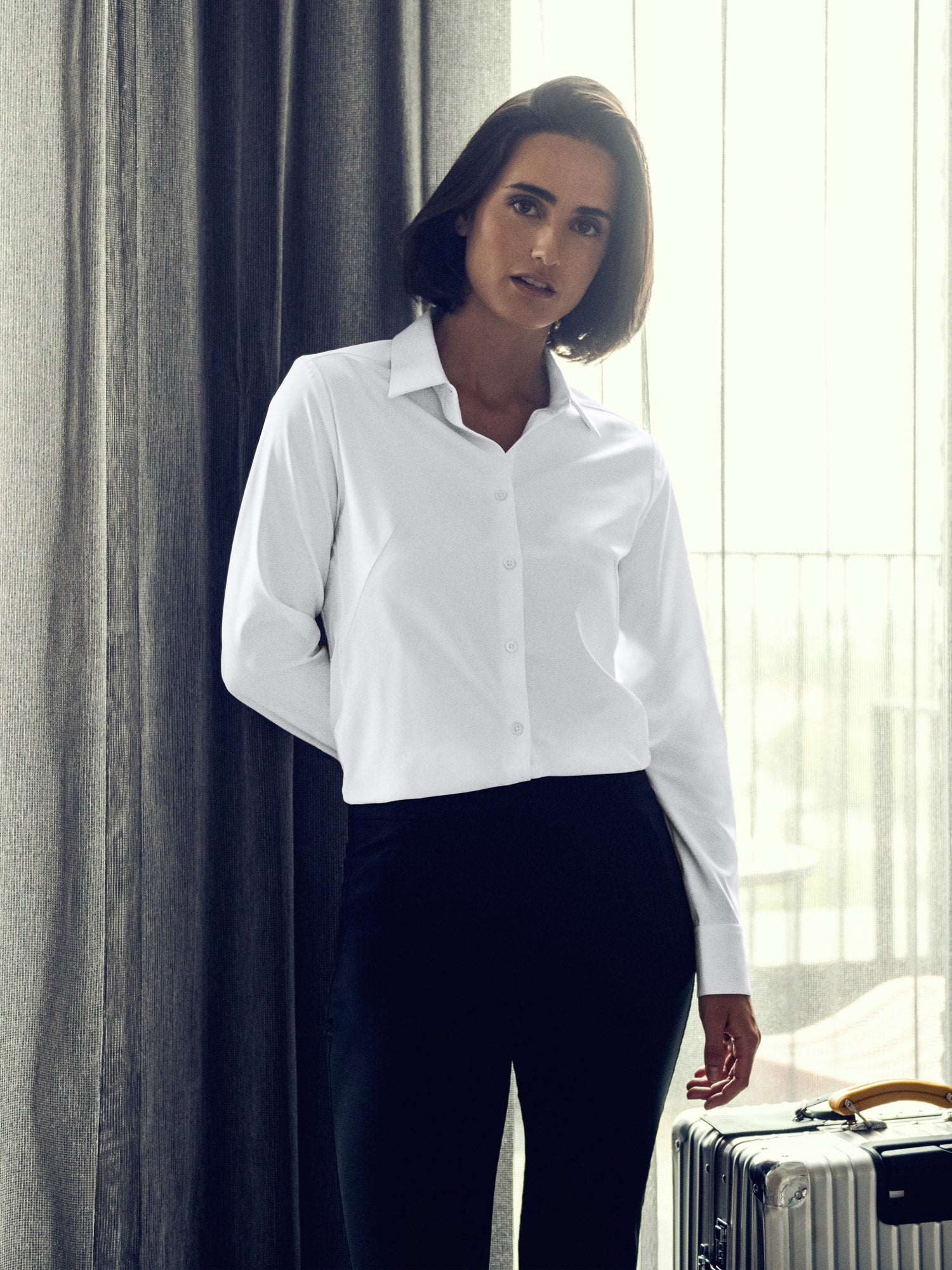 Designed for those who pack with intention. AeroZero° offers the comfort and polish of a dress shirt without the bulk, staying wrinkle-free and ready to wear right out of your bag.