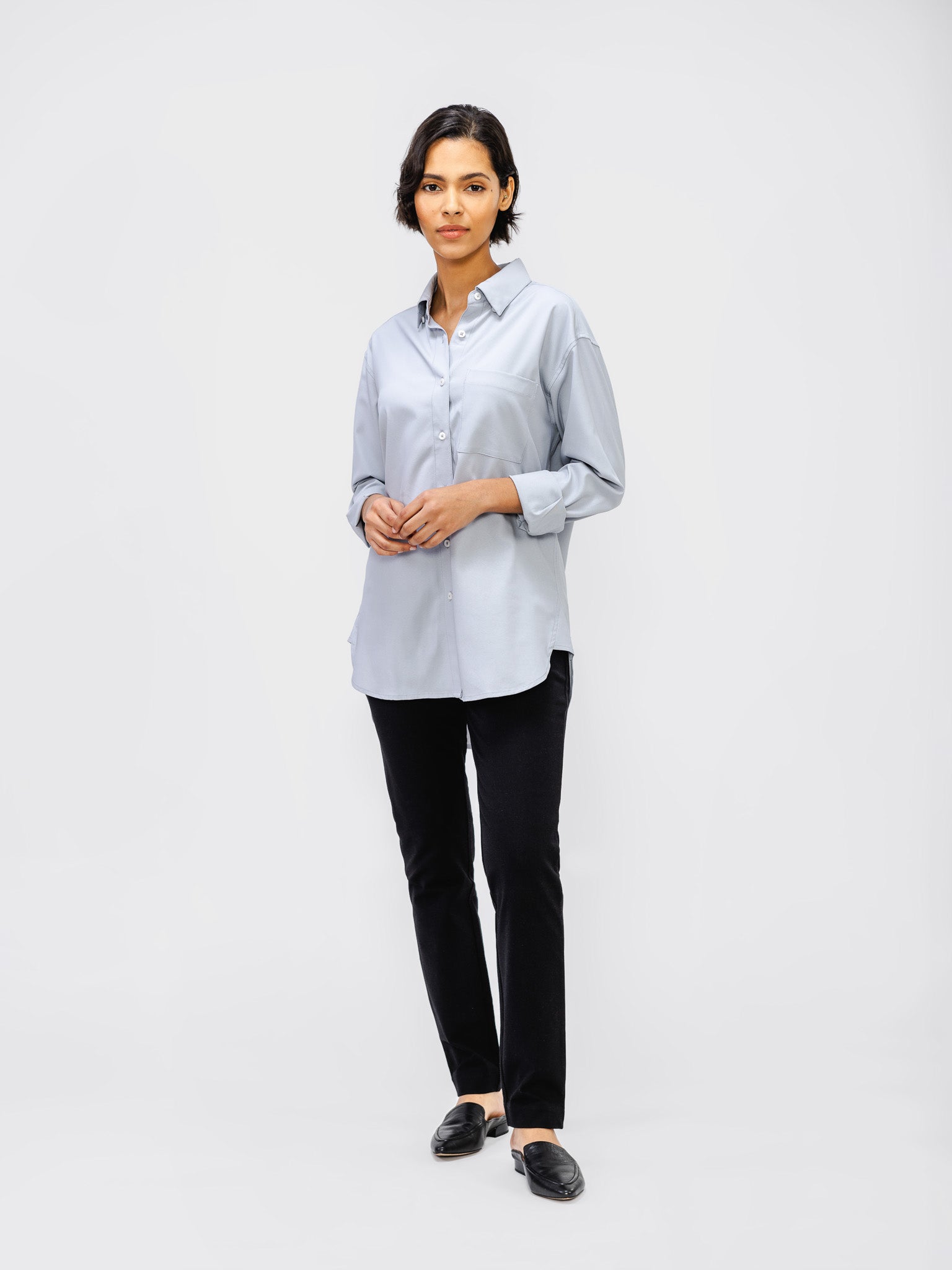 Silver Women's Aero Zero Oversized Shirt and Black Fusion Straight Leg Pant on model women's fusion straight leg pant black front flat Womens Black Fusion Straight Leg Pant - On Model women's fusion straight leg pant black side flat full women's fusion straight leg pant black bottom flat zoom