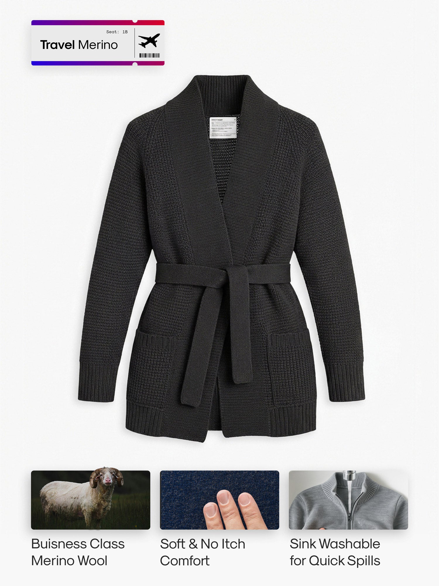 Women's Travel Merino Waffle Belted Cardigan