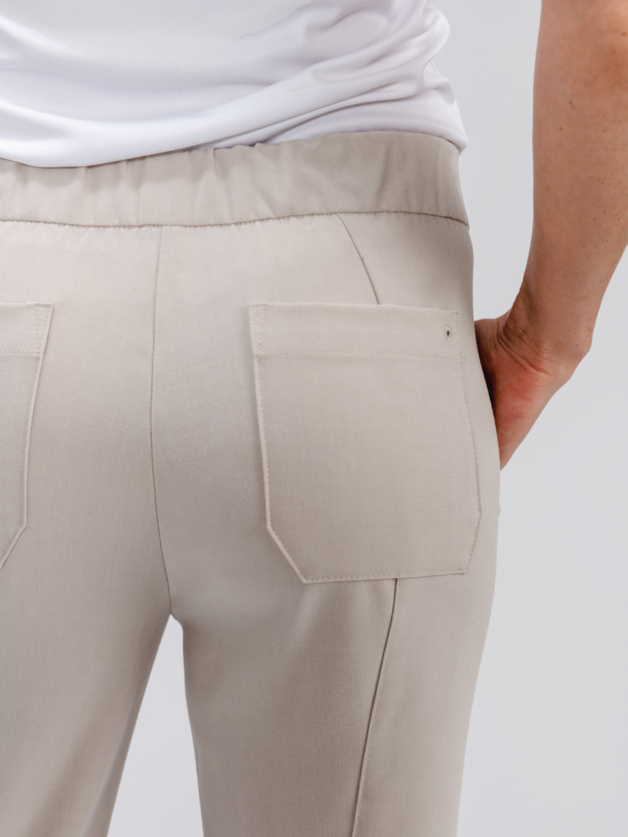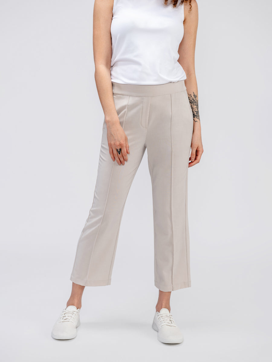 Women's Oatmeal Velocity Pull-On Pant and White Luxe Touch Tank on model on model women's oatmeal velocity pull on pant flat shot of front model wearing velocity pull on pant oatmeal and womens luxe touch tank white standing resting one hand on other laughing women's oatmeal velocity pull on pant flat shot of back close up of pocket on back of Back of Women's Oatmeal Velocity Pull-On Pant close up of split hem on back of Women's Oatmeal Velocity Pull-On Pant