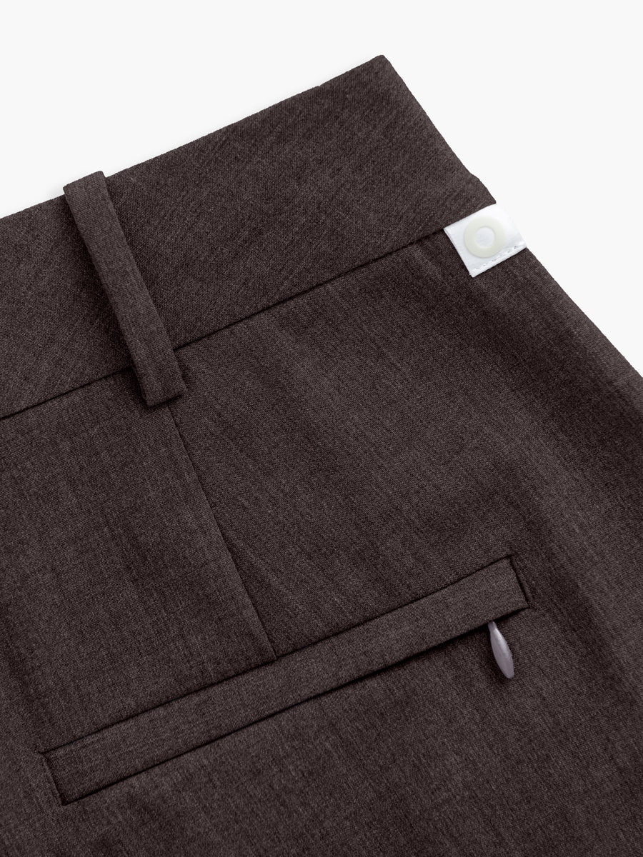 • Stretch waistband with front fly, belt loops + bar and hook closure